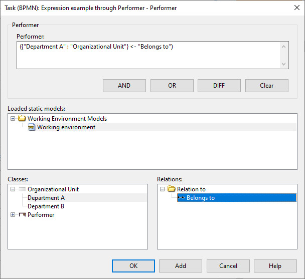 The top of the dialog contains the query with buttons to add code to combine multiple queries. The lists in the middle and the bottom allow to create a specific query by select existing objects. Note that only opened models are shown in the list in the middle. After selecting the necessary items from the lists (a model, a class or object and a relation in a specific direction) selecting the Add button at the bottom will create the query and append it to the value at the top.